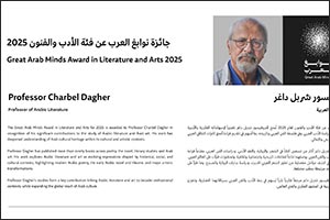 Dubai, 2 January 2026: His Highness Sheikh Mohammed bin Rashid Al Maktoum, Vice President, Prime Minister and Ruler of Dubai, congratulated Professor Charbel Dagher on winning the Great Arab Minds 2025 Award in the Literature and Arts category. His Highness highlighted the central role that literature and the arts have played in shaping societies and civilisations throughout history. In a post on X, His Highness said, "We congratulate the winner of the Great Arab Minds 2025 Award in Literature and Arts, Professor Charbel Dagher from Lebanon, Professor of Arabic Literature. Over several decades, he has made significant intellectual contributions across multiple literary fields, including poetry, writing, and literary criticism. He has also conducted in-depth studies of Arab arts, examining their historical ......read more
