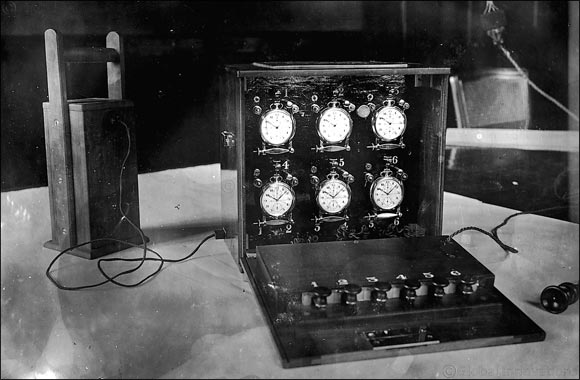 In 1948, the same Olympic Games year that the photofinish camera appeared, OMEGA also introduced photoelectric timing for the first time. The technology immediately replaced the limited capabilities of the human eye with a lightning fast electrical current. This beam of light ran back and forth along the finishing line, so that as soon as a runner crossed it, the stopwatches were triggered. Astonishingly, it gave times to the nearest 1/1000th of a second, surpassing all previous devices and rendering the finishing tape redundant.