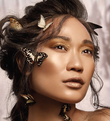 Reveal in a dramatic and glamorous eye look. Shape your eyes with our Angled Brush and cult classic Precision Gel Liner to create that perfect feline flick. Load up lashes with Masquara in Raven for added length and definition and finish with a veil of Broken Gold, your very own metallic liquid gold.