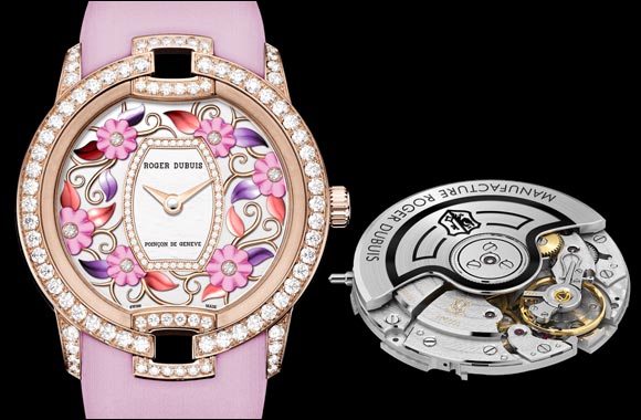 Mother-of-pearl dial, sculpted Grand Feu enamel flowers, diamonds set at the centre of the flowers, pink gold stems, brilliant-cut diamonds around the barrel, black transfers Roger Dubuis and Poinçon de Genève inscriptions