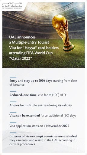The programme comes within the UAE's initiatives aiming to support the state of Qatar, in hosting the FIFA World Cup Qatar 2022. Through the Multiple-Entry Tourist Visa options, the UAE will be hosting the world cup fans, allowing them to enter UAE multiple times over a period of 90 days.
