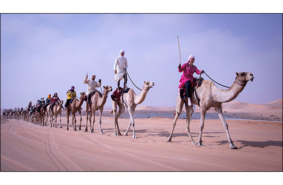 للوصول إلى وجهتهم الختامية في القرية التراثية بالقرية العالمية يوم 6 يناير المقبل، في الرحلة التي تستغرق 12 يوماً بداية من منطقة عرادة لمسافة 550 كم على ظهر المطية وسط الكثبان الرملية.