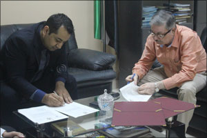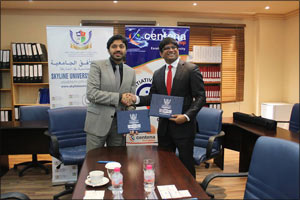 Dubai, UAE, December 7, 2016: Skyline University College (SUC) signed a memorandum of understanding (MOU) with eDurar on November 14, 2016, at SUC campus. SUC Deputy Director for Marketing and Public Relations, Mr. Firas Al Tabbaa and eDurar CEO, Mr. Mohammad Miqdadi signed the MOU on behalf of their respective parties. eDurar Relationship Manager Mr. Burhan Qazi, SUC Corporate Affairs Head Mr. Muhammad Rasheed Khalid, and SUC Associate Professor Dr. Riktesh Srivastava stood witness of the partnership made.